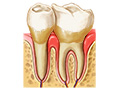 Depósitos duros de placa y sarro por encima y por debajo de las encías.
