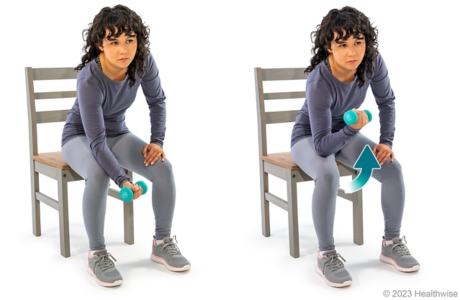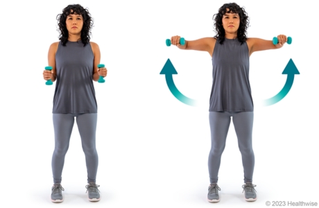 - Levante las pesas lentamente y los codos hacia los costados al nivel del hombro, manteniendo los codos flexionados. Mantenga los hombros bajos y relajados mientras levanta las pesas. Si nota que se encoge de hombros en dirección a las orejas, es posible que las pesas sean demasiado pesadas. Pruebe a usar pesas más livianas (o incluso ninguna pesa).