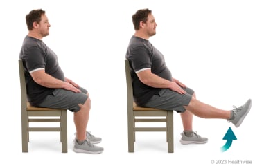 - En posición sentada en una silla, extienda la pierna y manténgala extendida por 6 segundos. No trabe la rodilla. Luego baje la pierna lentamente.