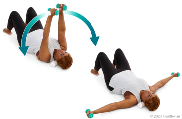 - Recuéstese sobre un banco o una pelota de ejercicio y sostenga pesas livianas en forma recta por encima del pecho. También puede usar latas de sopa o botellas de agua llenas como pesas. No trabe los codos. Puede tenerlos ligeramente flexionados si le resulta más cómodo.