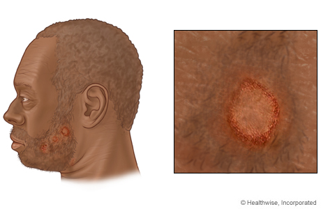 La tiña de la barba suele aparecer como parches redondos u ovalados de piel calva y escamosa. Por lo general, los parches circulares se extienden a lo largo de los bordes exteriores y se aclaran hacia el centro, dándole un aspecto de anillos. Pero no siempre se ve este patrón.